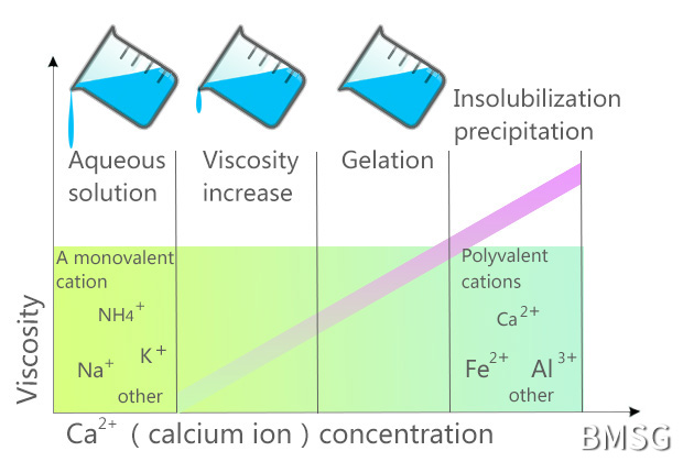 when meeting with calcium ion exchange action takes place rapidly to form gel, and the gel is anti-reversibility. the high G alginate gel is crispness but much rigider, while the high M alginate gel has the opposite property, flexibler with the less rigidity. different strengths of gel made by different proportions. with different gel, alginate can be used for difference of imitated food, medical materials, face masks, water treatment agents, clingfilm etcs.
