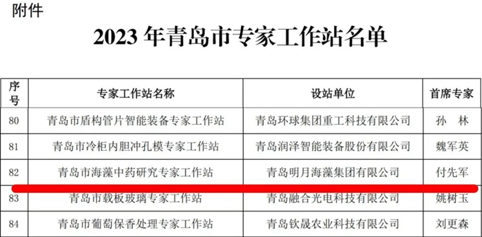 近日,青島市人力資源和社會保障局公布 2023 年青島市專家工作站名單,明月海藻集團獲批青島市海藻中藥研究專家工作站。