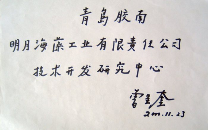 曾呈奎題寫“青島膠南明月海藻工業有限公司技術開發研究中心”