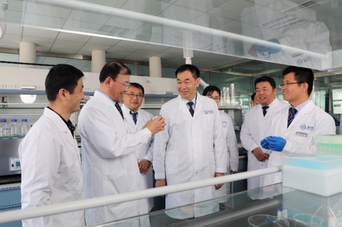 青島明月海藻集團董事長張國防(中)在國重實驗室交流產品研發工作