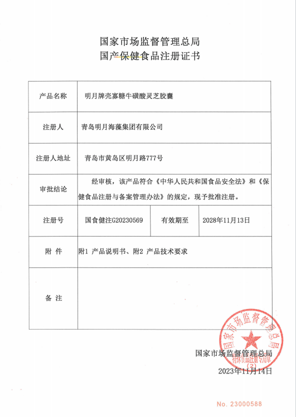 日前,青島明月海藻集團“明月牌?殼寡糖牛黃酸靈芝膠囊”獲批國家市場監督管理總局保健食品批件,注冊號國食健注G20230569。