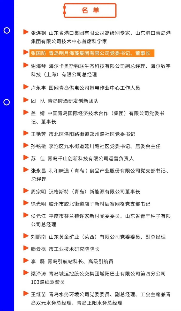 按照省委組織部部署,圍繞“十大創(chuàng)新”工作重點,青島市從4月份啟動了2022年“發(fā)現(xiàn)榜樣”活動,全市擬確定“創(chuàng)新榜樣”團隊2個、黨員20名。7月12日,青島市“創(chuàng)新榜樣”名單公示,其中,青島明月海藻集團董事局主席張國防入選。