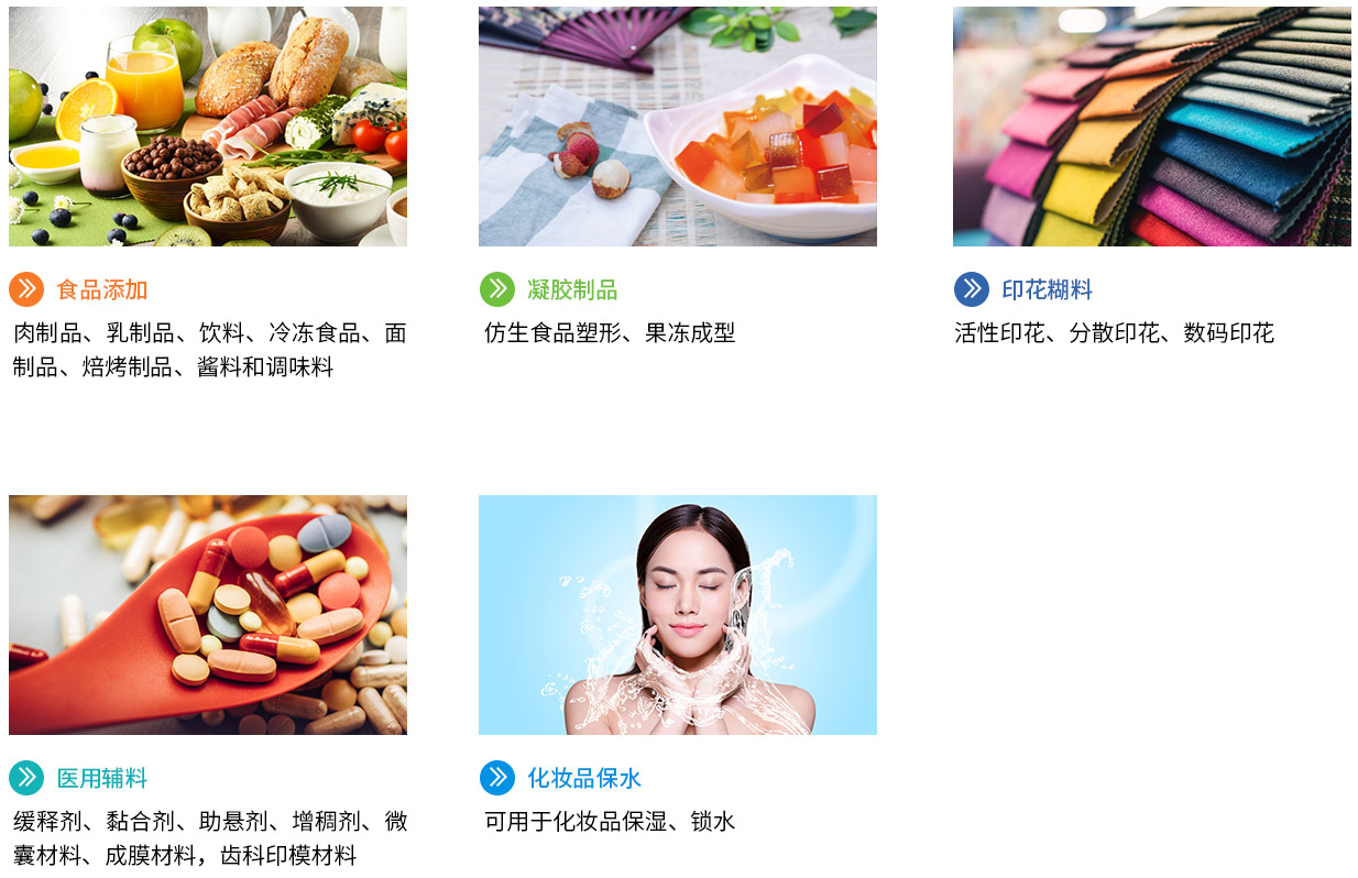 食品、化妝品增稠劑、粘合劑、穩定劑、成型劑。食品中主要用于仿型食品、面食、飲料、肉制品、餡料、果醬、寵物食品等